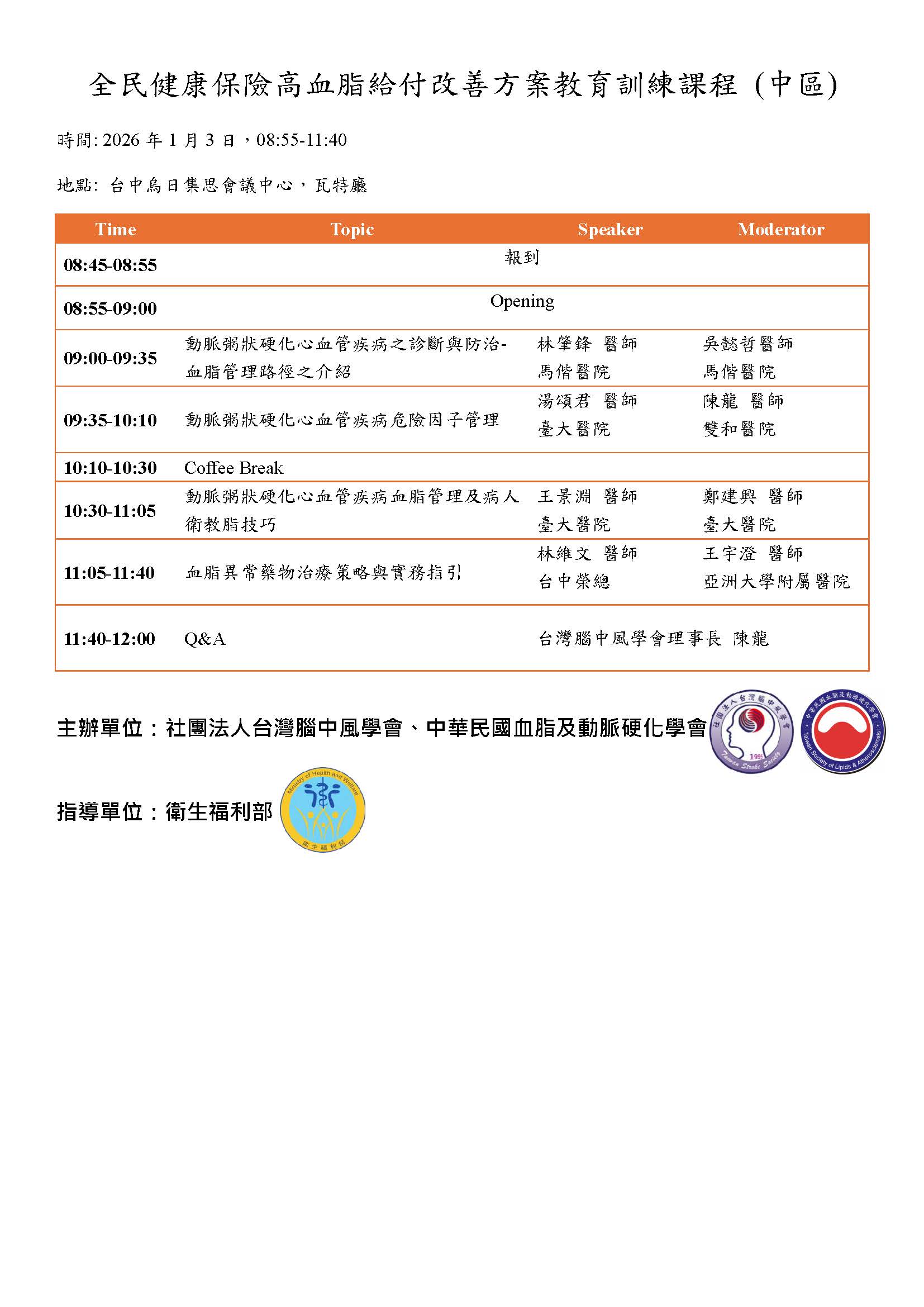 為協助臨床醫師與個案管理師掌握最新政策、治療策略及實務作法,台灣腦中風學會與中華民國血脂及動脈硬化學會將於
